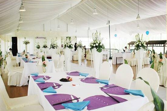 3、篷房效果:戶外婚禮注重個性、浪漫以及獨特性,篷房四周和內部可以使用各種配套設施,噴繪、頂幔、圍幔、燈光、LED大屏、音響、舞臺、T臺等,取得完全區別于酒店的新穎效果。