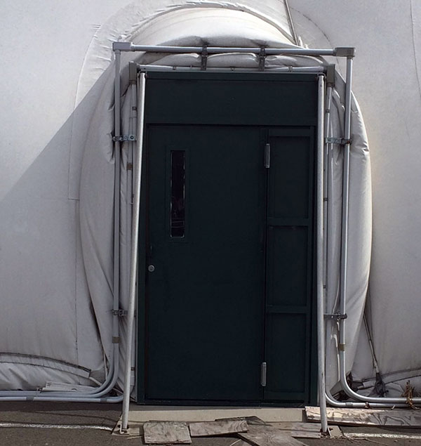 根據(jù)氣膜建筑的不同用途,在人員入口處配置旋轉(zhuǎn)門或者氣鎖門,在設(shè)備入口處配置氣鎖門,另外配置1~3個應(yīng)急疏散門(簡稱應(yīng)急門)。旋轉(zhuǎn)門和氣鎖門均采用高強度的鋁合金材料或者不銹鋼材料制作而成,既堅固耐用又氣派堂皇。氣鎖門是雙層門,有一個壓力平衡室,還采用了自動電磁閉合裝置,有效地防止了氣體的泄漏。