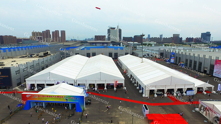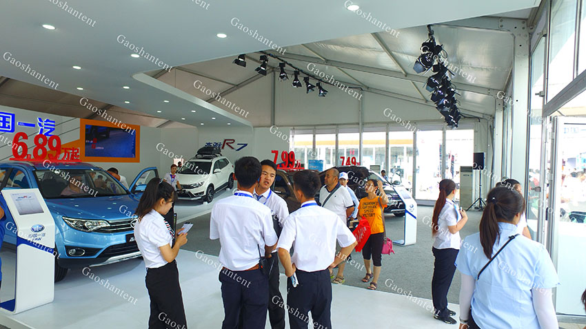 此次高山篷房還為汽博會提供大量的內部配套設施,例如中央空調、地板、玻璃門、玻璃墻、燈光舞臺等。我們通過做好相應的配套設備,力求為所有大型車展,慶典,活動等提供服務,讓客戶省心與安心。