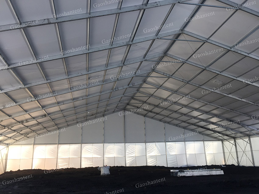 與傳統(tǒng)建筑相比,篷房本身屬于臨時(shí)建筑,不需要繁瑣的審批手續(xù),高山利用客戶園區(qū)自由場(chǎng)地,建造跨度50m、頂高15m的全鋁合金倉(cāng)儲(chǔ)中轉(zhuǎn)空間,隨著加工地點(diǎn)、環(huán)保要求的變化,靈活實(shí)現(xiàn)可移動(dòng),從容解決環(huán)保難題