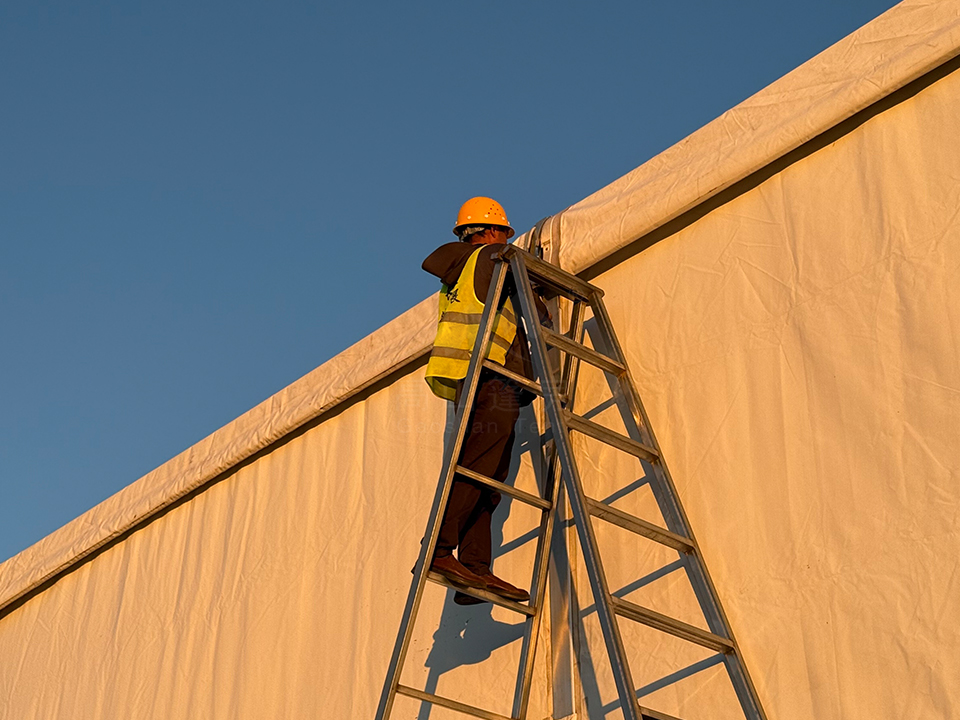 工人們的身影在光影里忙碌著,汗水混著霞光,每一寸搭建都格外扎實。從晨光微亮到暮色四合,他們沒錯過長春每一縷醉人的夕陽,也沒怠慢篷房的每一根梁架、每一處銜接——為了給長春航展搭起穩妥的“家”,他們把艱辛與執著,都揉進了這潔白的建筑里。