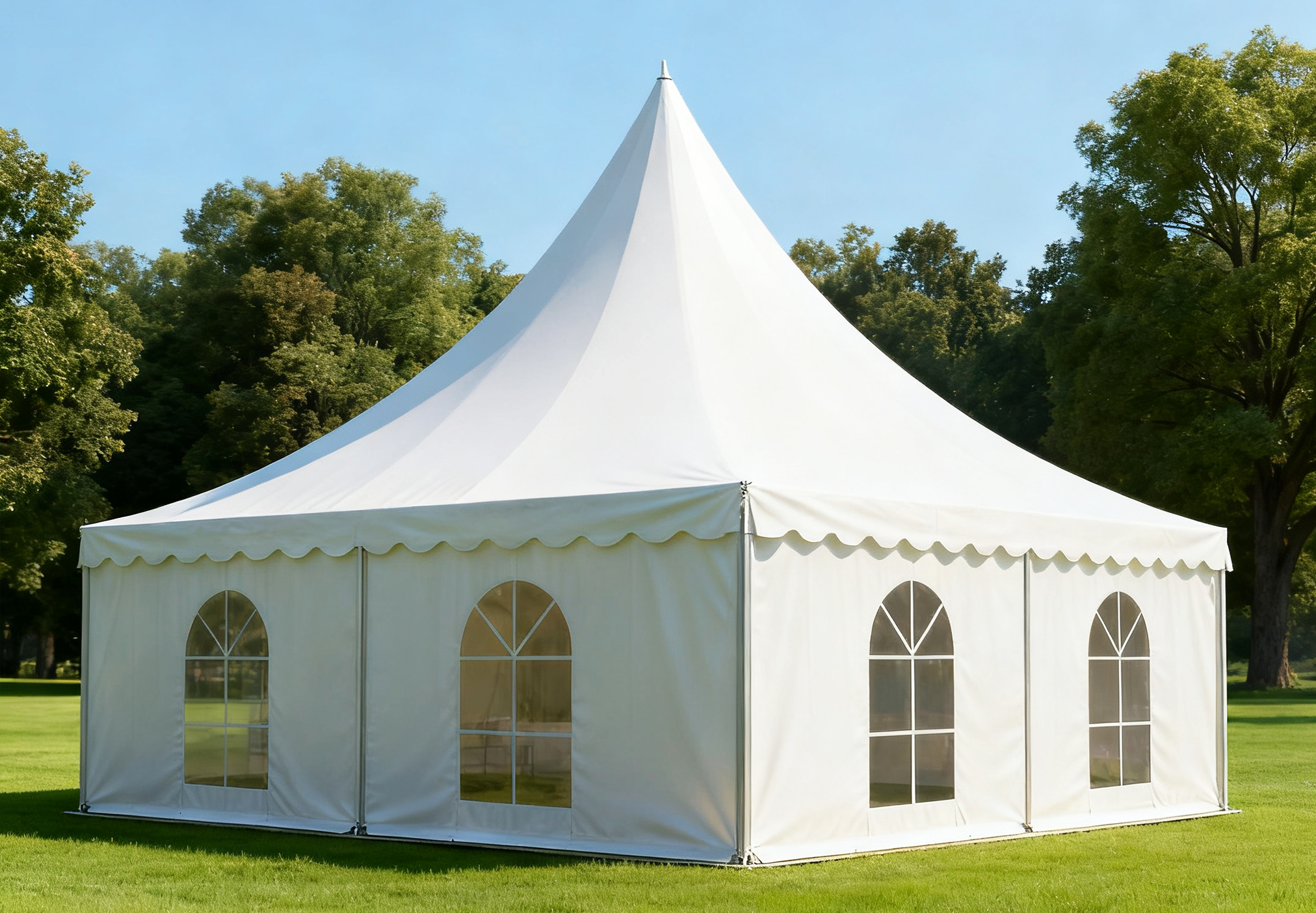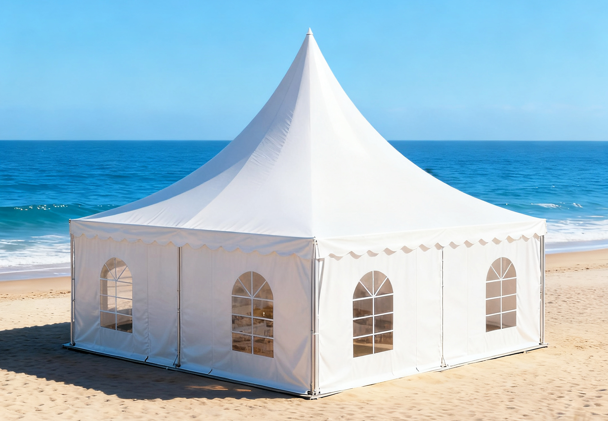 尖頂篷房,又稱寶塔帳篷或錐頂篷房,是一種專為戶外活動設(shè)計的臨時建筑。它以獨(dú)特的尖頂造型打破了傳統(tǒng)篷房的單調(diào)輪廓,棱角分明的立體幾何結(jié)構(gòu)兼具現(xiàn)代藝術(shù)感與視覺沖擊力,為各類活動增添獨(dú)特格調(diào)。