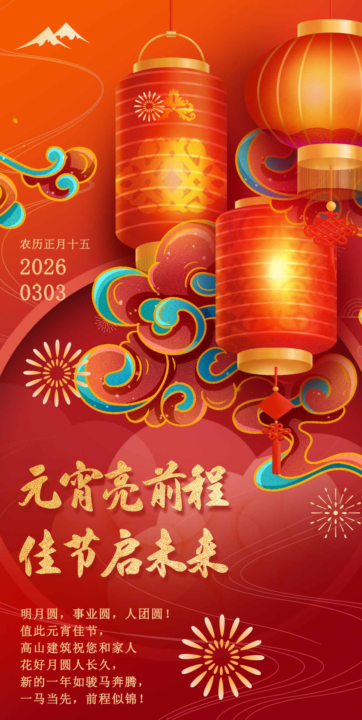 燈火璀璨映佳節(jié),元宵安康啟新篇。當(dāng)一輪圓月懸于夜空,當(dāng)一盞盞花燈點(diǎn)亮街巷,我們迎來了正月十五元宵節(jié)——這個承載著團(tuán)圓期許、寄托著美好愿景的傳統(tǒng)佳節(jié)。值此良辰,高山篷房向每一位并肩同行的伙伴、每一位支持信賴我們的客戶,致以最誠摯的元宵祝福,愿大家歲歲皆圓滿,事事皆順意。